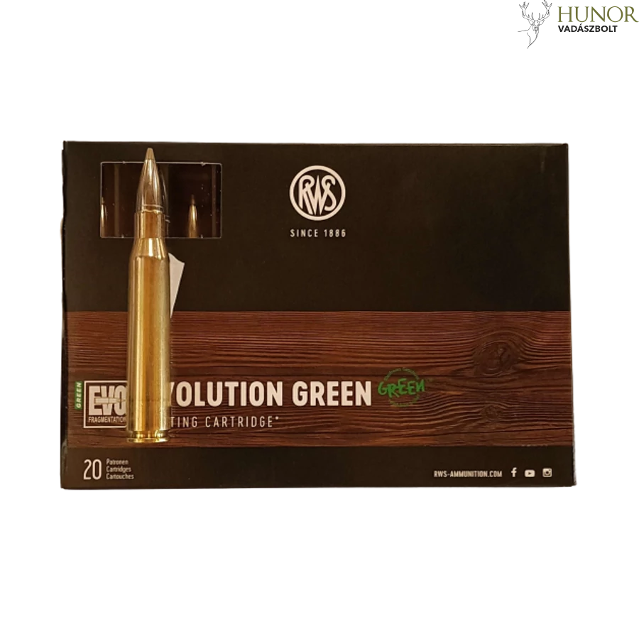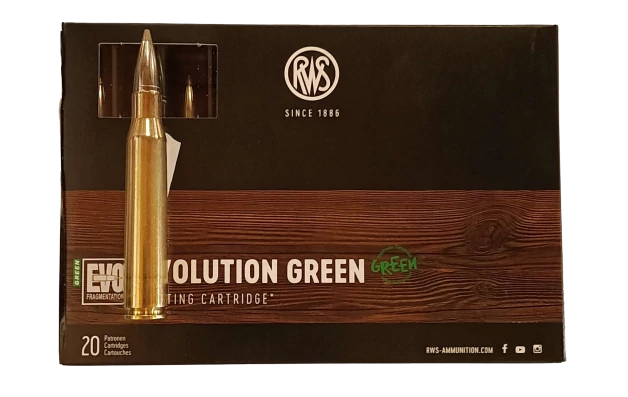 Az RWS EVOLUTION GREEN egy részlegesen töredező, ólommentes lövedék, amely egy sor egymással összefüggő konstruktív részletet tartalmaz. Az RWS EVOLUTION GREEN meggyőző teljesítményét az élelmiszer-biztonságos ónból készült kettős maggal éri el, amely az elülső mag különleges előfragmentációjával rendelkezik. Ez a Speed Tip hegyével együttműködve még nagy távolságokra is kiemelkedő lövőerőt eredményez. Ez a lövedék minden közönséges vadállat ellen alkalmas, de ideális a könnyű és közepes vadak ellen.
